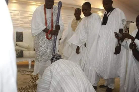 Photo of former President Olusegun Obasanjo prostrating before the Ooni of Ife has been released.